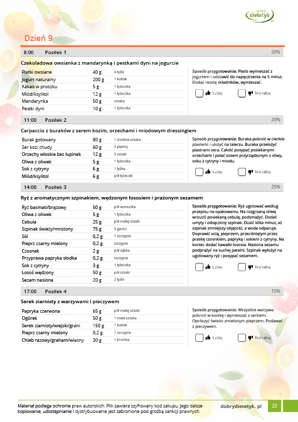 w formie propozycji posiłków (zamiast pojedynczych jadłospisów jednodniowych, przygotowano propozycje kilku propozycji dań na każdy posiłek). Tutaj nie uzależniamy Cię od tego jakie masz np. w danym dniu zjeść śniadanie czy obiad, tylko sam wybierasz sobie ulubione danie z kilku przedstawionych przez nas propozycji.
