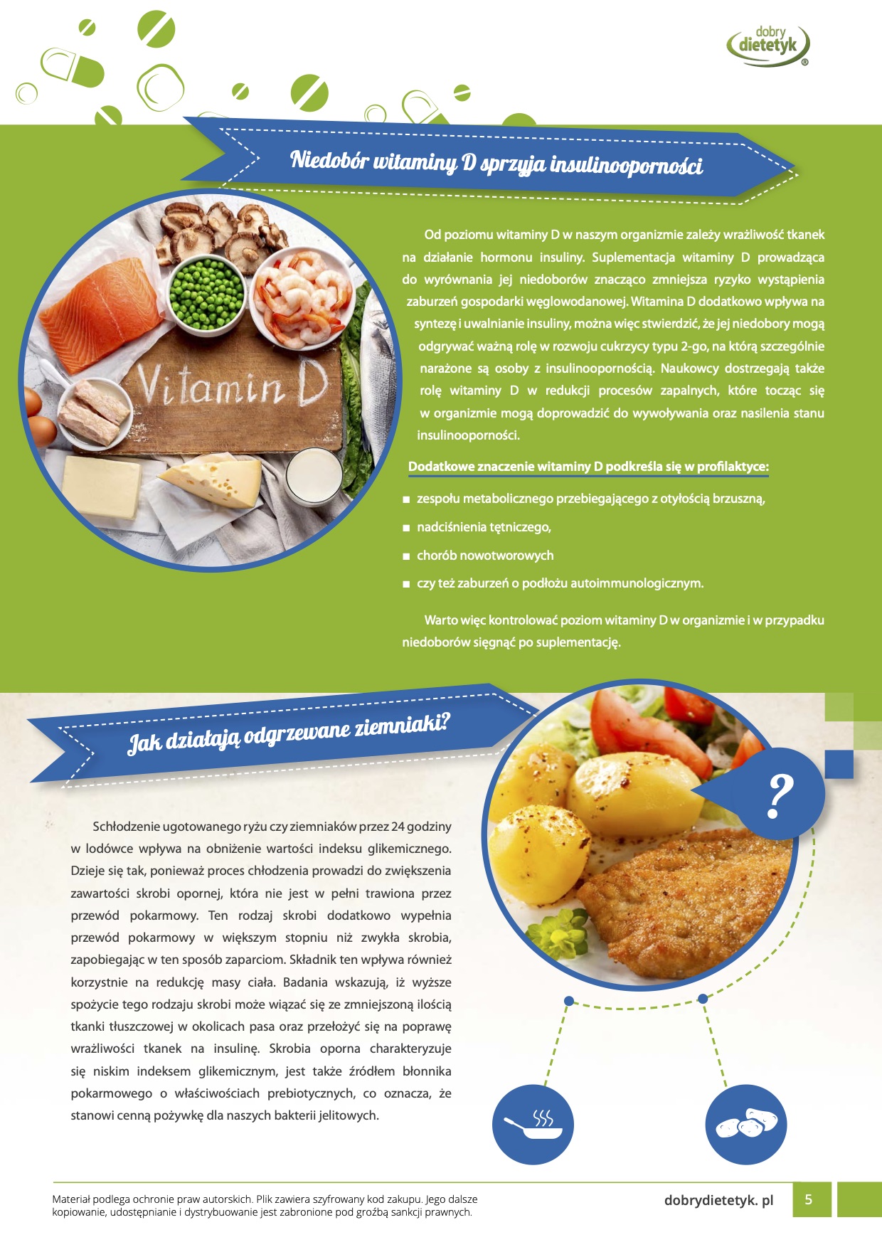 Kompleksowy program żywieniowy dla KOBIET z zaburzeniami gospodarki węglowodanowej, takimi jak: insulinooporność oraz hiperinsulinemia. Jadłospis na 30 dni został opracowany tak, by wspomagać redukcję masy ciała oraz regulację poziomu glukozy i insuliny we krwi. Dieta została skomponowana o zasady niskiego ładunku glikemicznego z ograniczeniem podaży cukrów prostych. Zwrócono także uwagę na zawartość najważniejszych przy zaburzeniach gospodarki węglowodanów składników, takich jak: witaminy z grupy B, magnez, kwasy tłuszczowe omega-3 oraz błonnik pokarmowy. Zachowane zostały odpowiednie dla zachowania zdrowia proporcje kwasów tłuszczowych. Dieta sprawdzi się także idealnie u kobiet, u których stwierdzono hipoglikemię reaktywną lub stan przedcukrzycowy.