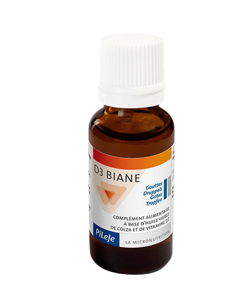 D3 Biane w kroplach to suplement diety na bazie oleju rzepakowego i witaminy D3. Suplement diety zapewnia 100% dziennego zapotrzebowania w witaminę D3, która przyczynia się do utrzymania właściwej struktury kostnej i prawidłowego funkcjonowania systemu odpornościowego.