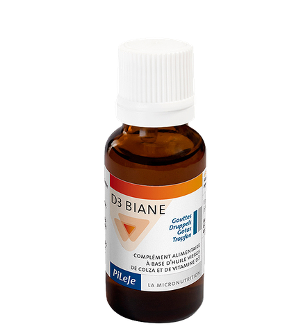 D3 Biane w kroplach to suplement diety na bazie oleju rzepakowego i witaminy D3. Suplement diety zapewnia 100% dziennego zapotrzebowania w witaminę D3, która przyczynia się do utrzymania właściwej struktury kostnej i prawidłowego funkcjonowania systemu odpornościowego.