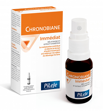 Chronobiane Immédiat to suplement diety w formie sprayu na bazie melatoniny oraz wyciągu z głogu. Melatonina pomaga skrócić czas zasypiania i łagodzi skutki jet lagu. Głóg chroni serce, normuje ciśnienie krwi, a także jest wskazany w stanach nadmiernej pobudliwości, rozdrażnienia czy bezsenności. Podjęzykowa forma sprayu sprawia, że melatonina jest bardziej biodostępna, a jej działanie szybsze. Jednym z podstawowych składników mechanizmu snu jest melatonina, hormon wytwarzany naturalnie przez szyszynkę w ciemności. Wydzielając melatoninę, szyszynka informuje mózg, że jest ciemno i że jest to dobry czas na sen. Synteza melatoniny rozpoczyna się przy braku światła i osiąga maksimum między 2 a 4 rano, a następnie spada w drugiej połowie nocy, aby przygotować się na czuwanie. U niektórych osób ten komunikat nie działa już prawidłowo, powodując trudności w zasypianiu lub opóźniając czas snu. „Resynchronizację” można uzyskać podwyższając poziom melatoniny dzięki 1 lub 2 rozpyleniom Chronobiane Immediate przed snem lub w momencie przebudzenia (1 rozpylenie dostarcza 0,5 mg melatoniny). Rekomendowany do suplementacji w przypadku: • trudności z zaśnięciem, • łagodzenia skutków jet lagu, • budzenia się w nocy, celem ułatwienia ponownego zaśnięcia. Środki ostrożności dotyczące stosowania: może być podawany tylko dzieciom i młodzieży na podstawie porady lekarskiej. Niezalecany dla kobiet w ciąży i / lub karmiących piersią, osób cierpiących na choroby zapalne lub autoimmunologiczne, epileptyków, astmatyków oraz osób z zaburzeniami nastroju, zachowania lub osobowości. W połączeniu z leczeniem farmakologicznym należy zasięgnąć porady lekarza lub farmaceuty.Rekomendowany do suplementacji w: